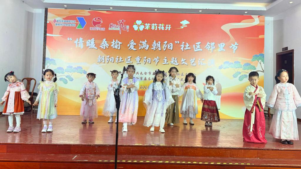 2025年10月28日下午,朝阳社区活动中心内暖意融融,“情暖桑榆 爱满朝阳”社区邻里节重阳节主题文艺汇演在此温情开幕。朝阳幼儿园的党员教师带领大班幼儿,以一场充满传统文化韵味的表演,为现场老年居民送上了别样的节日祝福。