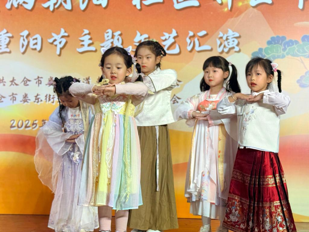 活动中,大班幼儿身着汉服,他们动作稚嫩却认真,通过《中华孝道》主题表演,将“孝亲敬老”的传统美德融入每一个手势与步伐,一句句“祝爷爷奶奶重阳节快乐”的童声真挚响亮,瞬间拉近了与在场老人的距离。